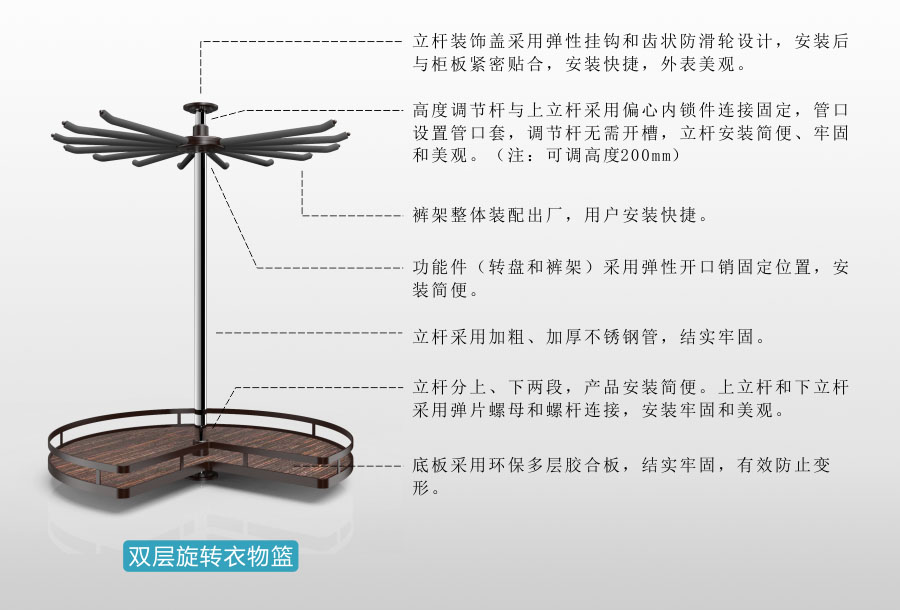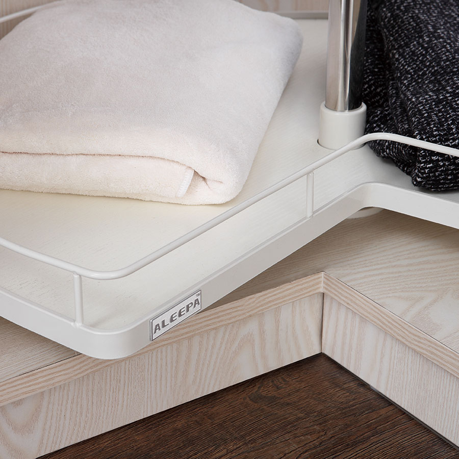 可 360 度旋轉,多功能轉角衣柜收納五金,可掛褲子,可放置衣物。充分利用衣柜轉角空間,方便存取。