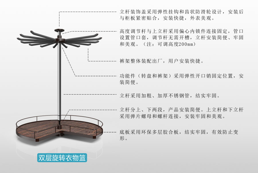可 360 度旋轉,多功能轉角衣柜收納五金,可掛褲子,可放置衣物。充分利用衣柜轉角空間,方便存取。
