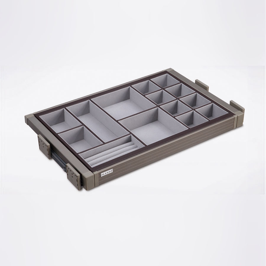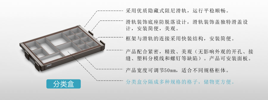 采用高純度鋁合金框架,連接件采用優質 ABS工程塑料,產品結實牢固。采用優質隱藏式阻尼滑軌,推拉順滑。框架寬度可調,適應不同柜體寬度。接縫遮蓋處理,外觀精致美觀。采用快速拆裝結構,方便安裝和清理保養。