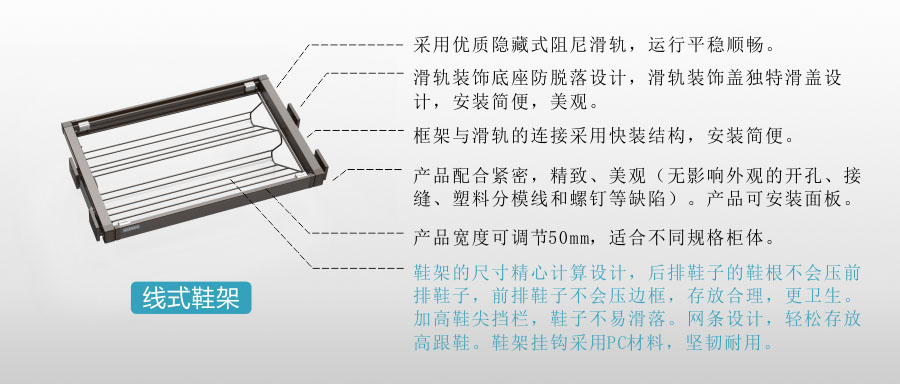 采用高純度鋁合金框架,連接件采用優質 ABS工程塑料,產品結實牢固。采用優質隱藏式阻尼滑軌,推拉順滑??蚣軐挾瓤烧{,適應不同柜體寬度。接縫遮蓋處理,外觀精致美觀。采用快速拆裝結構,方便安裝和清理保養。