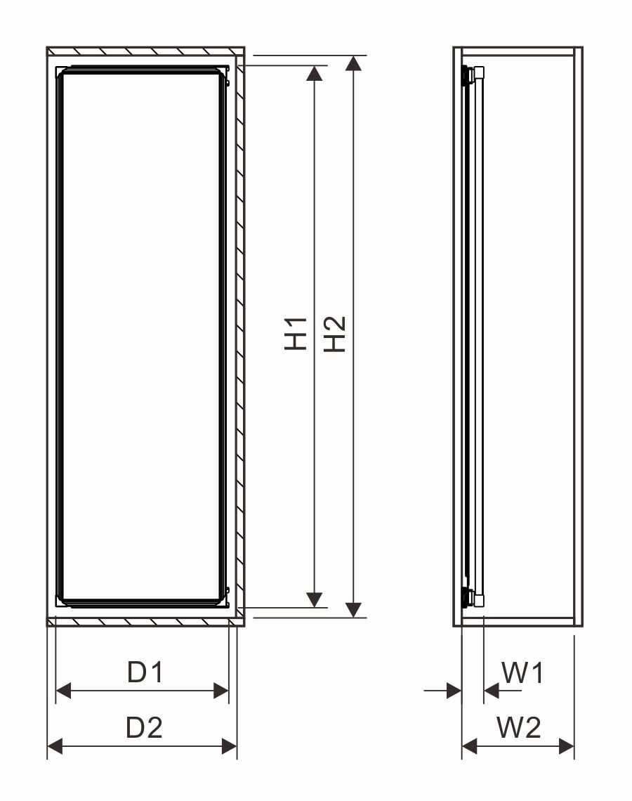 | 型號 | 柜體規格 | 外觀尺寸 寬(W1)x高(H1)x深(D1) | 柜體內空 寬(W2)x高(H2)x深(D2) |